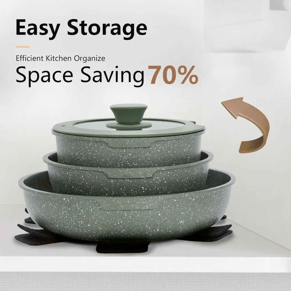 10-Piece Nonstick Cookware Set – Detachable Handle, Induction Ready